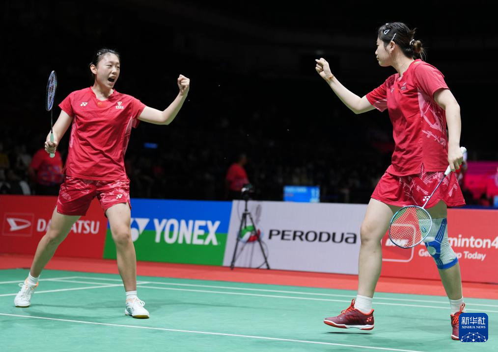 5月22日,坑姝良(右)/李華洲在比賽中慶祝得分。當日,在馬來西亞吉隆坡舉行的2025年馬來西亞羽毛球大師賽女子雙打八分之一決賽中,中國組合坑姝良/李華洲2比1戰(zhàn)勝中國臺北組合謝沛珊/洪恩慈,晉級八強...