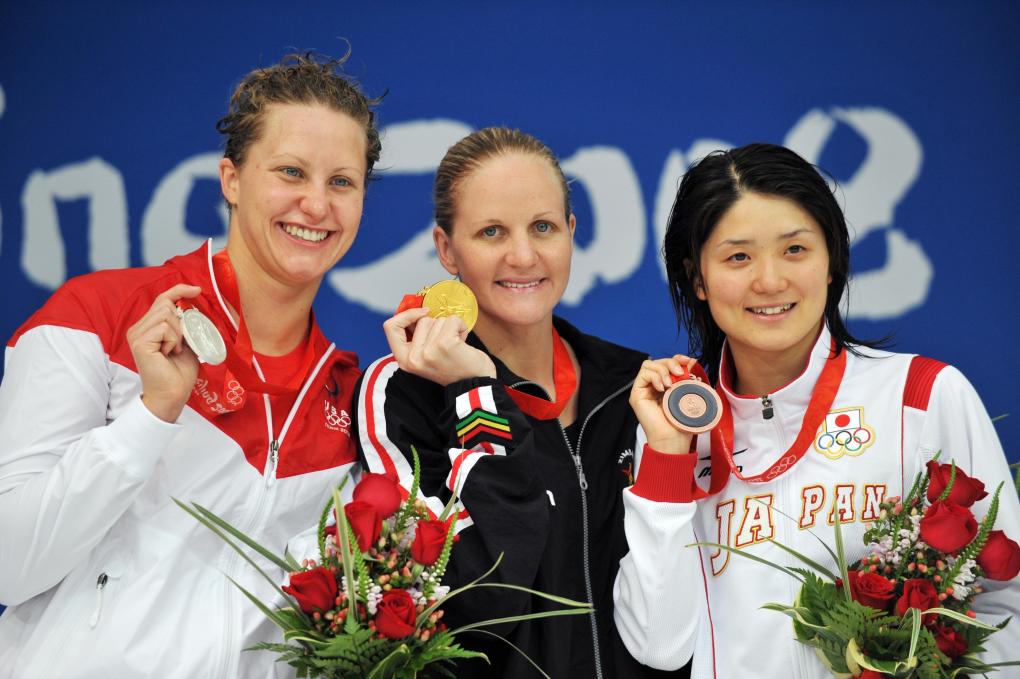 ↑2008年8月16日,考文垂(中)在“水立方”獲得北京奧運會女子200米仰泳冠軍。體育日報記者 王定昶 攝
