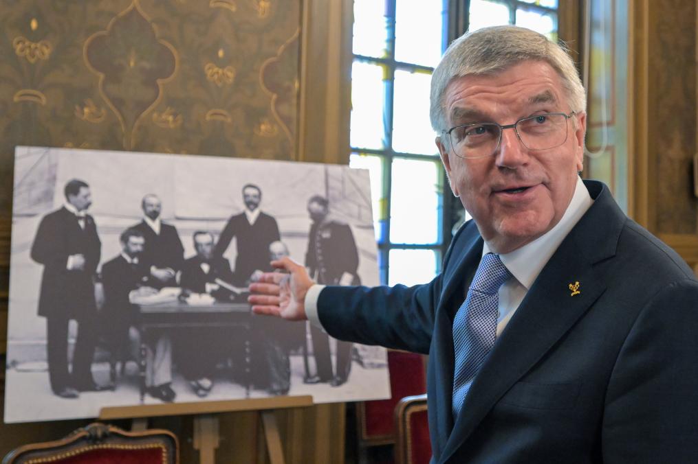↑2024年7月19日,巴赫指向首屆國際奧委會成員的照片。當日,巴赫到訪巴黎索邦大學。1892年,“現(xiàn)代奧林匹克之父”顧拜旦在此發(fā)表演講,首次公開提出恢復奧運會。1894年6月23日,國際奧委會在此正式成立。體育日報發(fā)